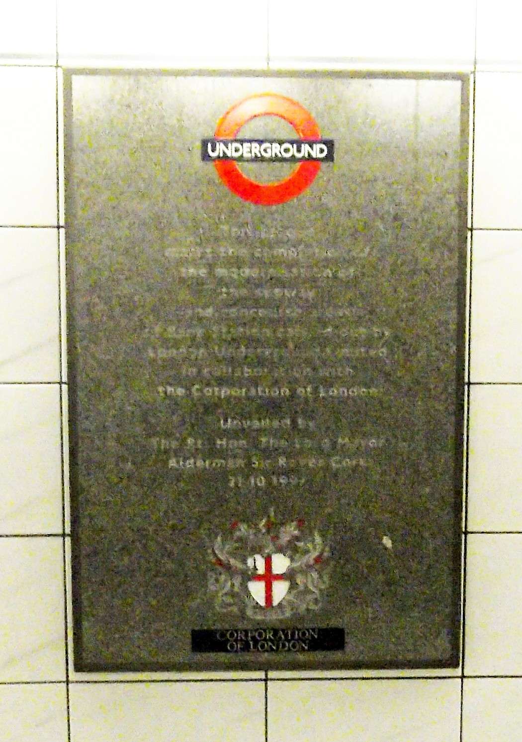This plaque marks the completion of the modernisation of the subway and concourse areas of Bank Station carried out by London Underground Limited in collaboration with the Corporation of London.