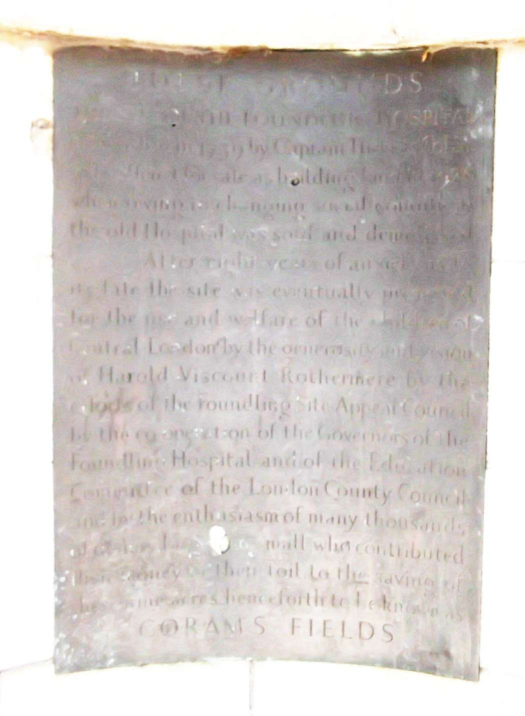 These grounds, the site of the Foundling Hospital, established in 1739 by Captain Thomas Coram, were offered for sale as housing land in 1926 when owing to changing social conditions the old hospital was sold and demolished. After eight years of anxiety to its fate the site was eventually preserved for the use and welfare of the children of Central London by the generosity and vision of Harold Viscount Rothermere, by the efforts of the Foundling Site Appeal Council, by the co-operation of the governors of the Foundling Hospital and the Education Committee of the London County Council, and by the enthusiasm of many thousands of donors, large and small, who contributed their money or their toil to the saving of these nine acres, henceforth to be known as Coram’s Fields