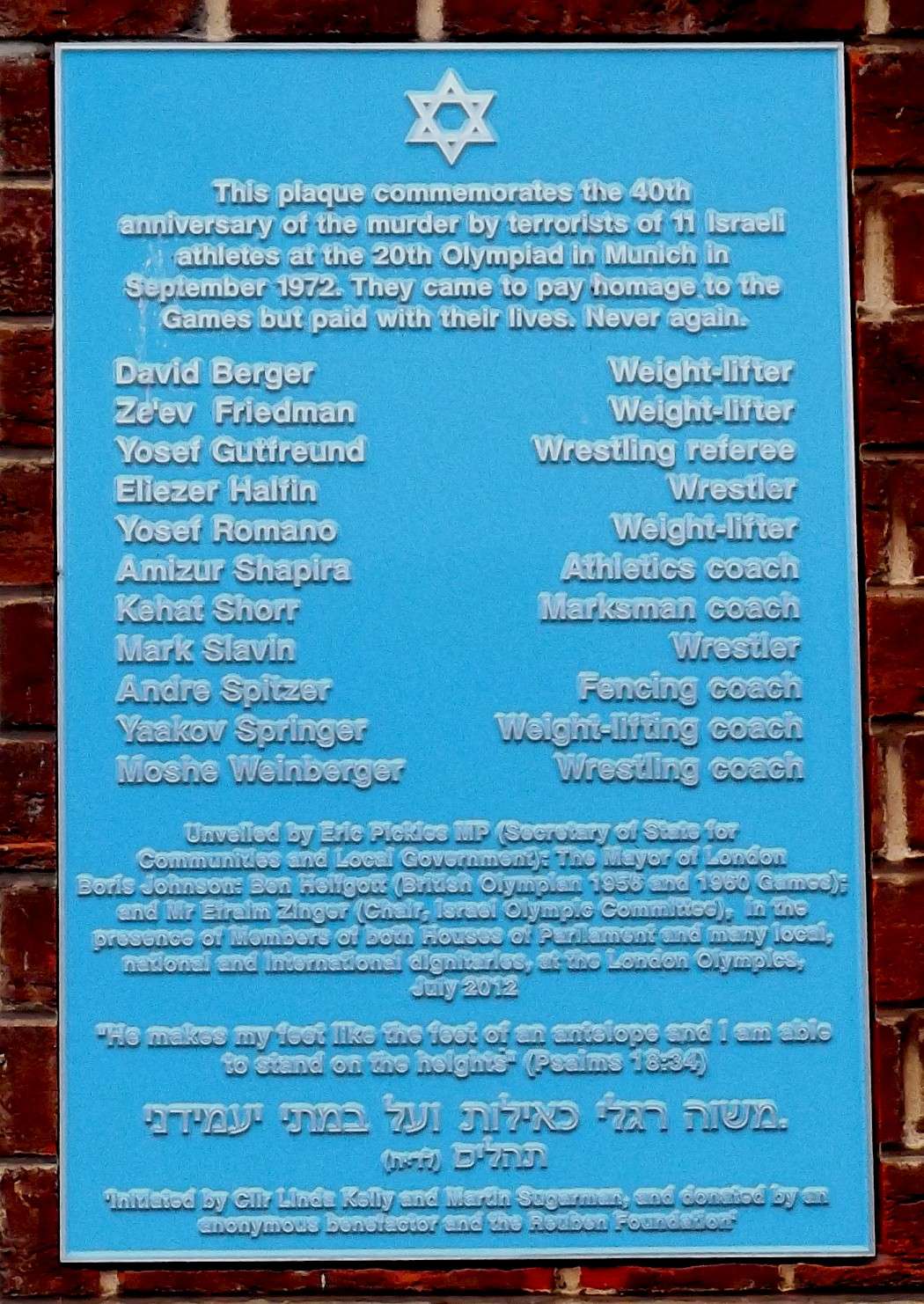 This plaque commemorates the 40th anniversary of the murder by terrorists of 11 Israeli athletes at the 20th Olympiad in Munich in September 1972. They came to pay homage to the Games but paid with their lives. Never again.