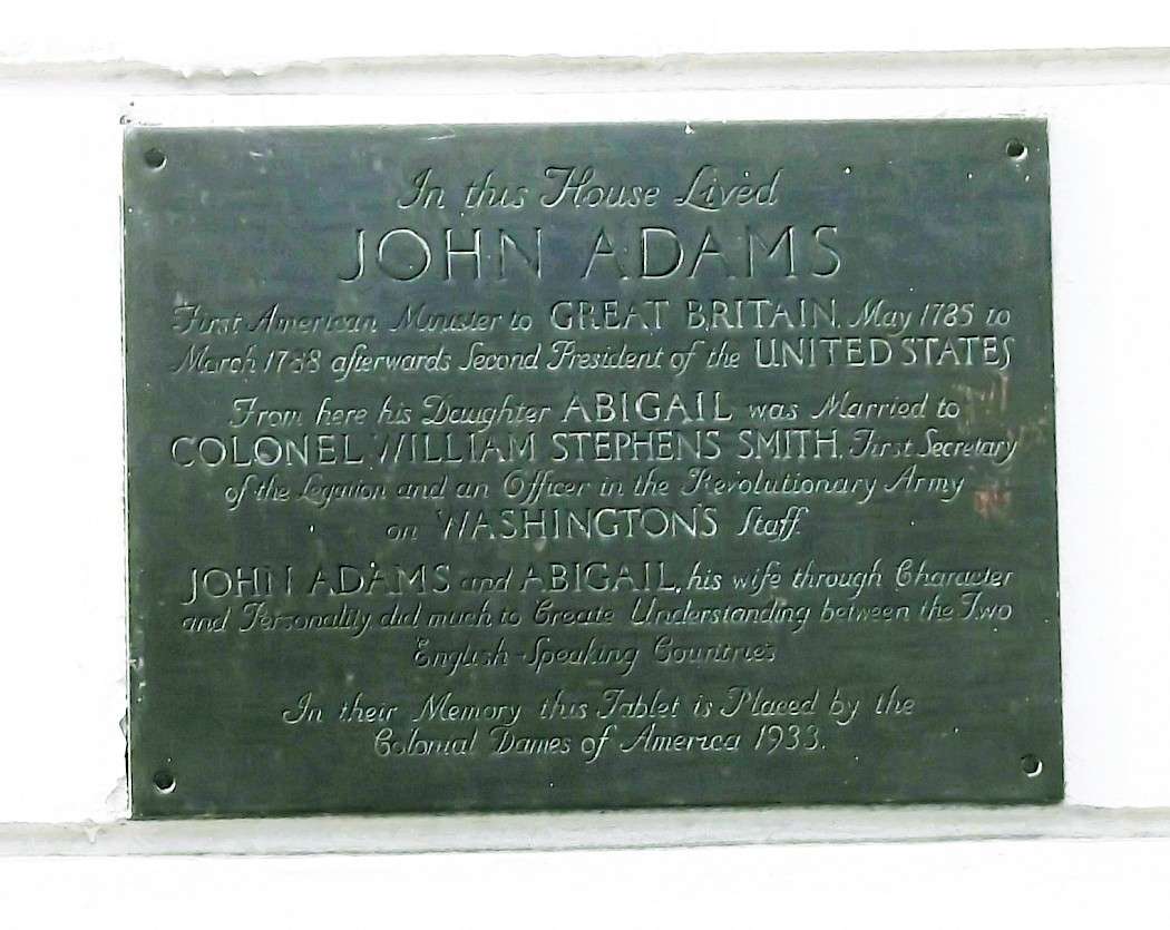 In this house lived John Adams, first American Minister to Great Britain, May 1785 to March 1788, afterwards Second President of the United States. From here his daughter Abigail was married to Colonel William Stephens-Smith, First Secretary of the Legation and an officer in the Revolution Army on Washington's staff.