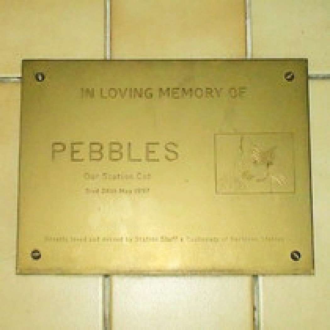 Inscription reads: In loving memory of Pebbles our station cat, died 26th May 1997. Greatly loved and missed by station staff & customers of Barbican Station