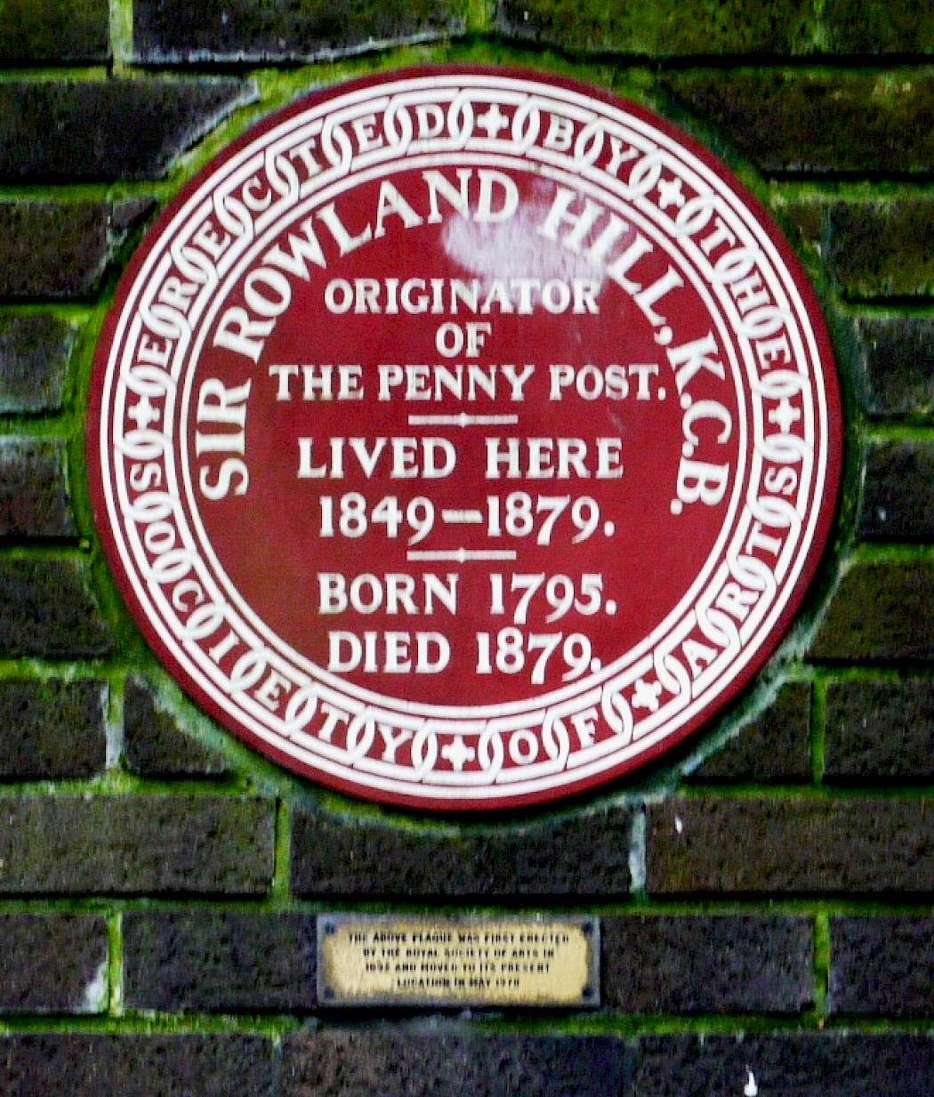 Inscription on small plaque reads: The above plaque was first erected by the Royal Society of Arts in 1892 and moved to its present location in May 1978.