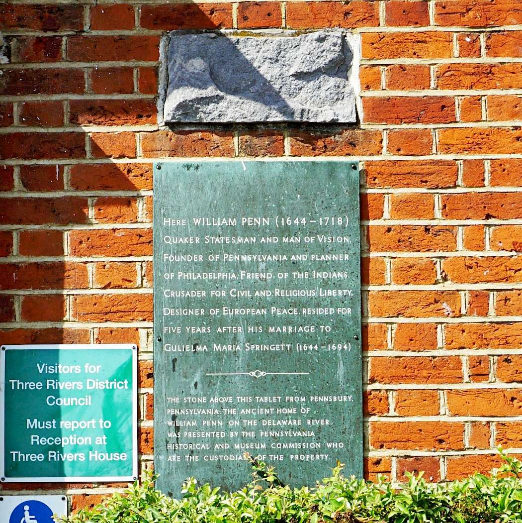 Here William Penn (1644 - 1718) quaker statesman and man of vision, founder of Pennsylvania and planner of Philadelphia, friend of the indians, crusader for civil and religious liberty, designer of European peace, resided for five years after his marriage to Gulielma Maria Springett (1644 - 1694).